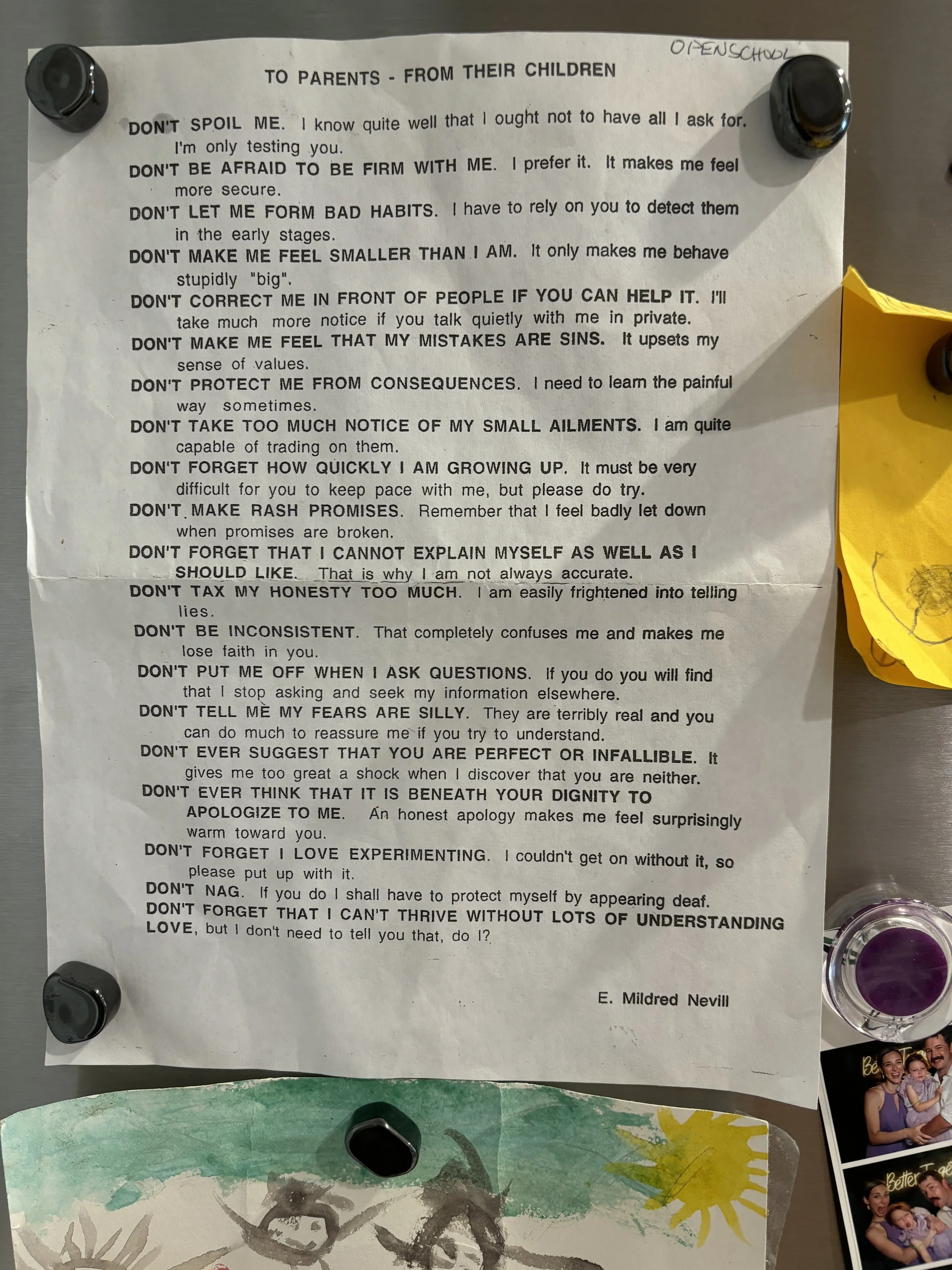Here is a handout (yes, paper) that my parents kept over the past few decades- it was given to them when I started at The Open School in 2nd grade. It's on my fridge and offers my husband and I important reminders that ground us as we navigate the beautiful and unpredictable journey of parenting our children.